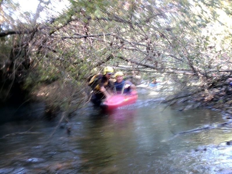 Au pont à la corde, Gilles, descendu photographier, se fait piquer son kayak par un filet de courant : seul Olivier, après un sprint sur la berge et un plongeon style Hulk, réussit à le stopper.